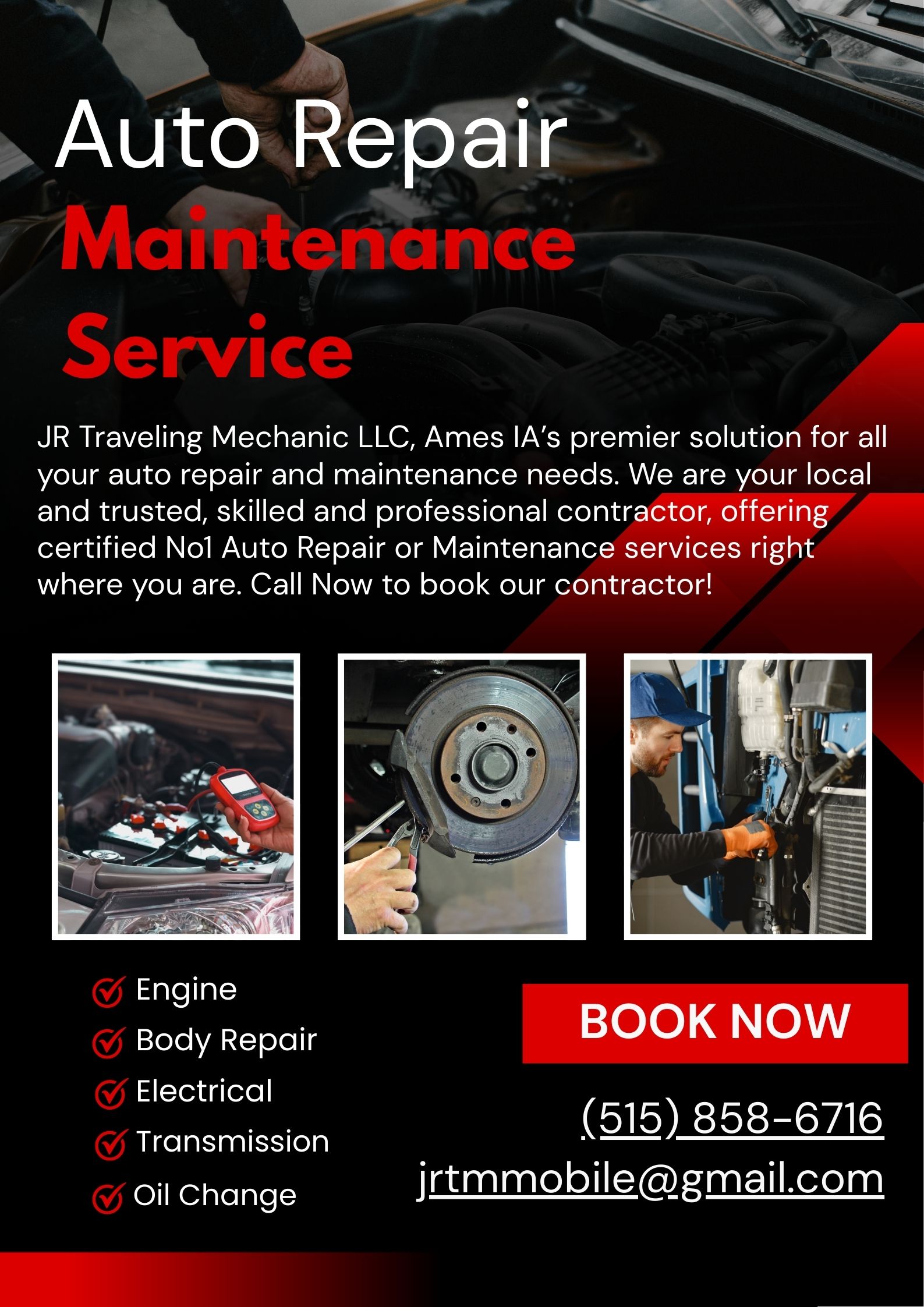 JR Traveling Mechanic LLC, Ames IA’s premier solution for all your auto repair and maintenance needs. We are your local and trusted, skilled and professional contractor, offering certified No1 Auto Repair or Maintenance services right where you are. Call Now to book our contractor!
